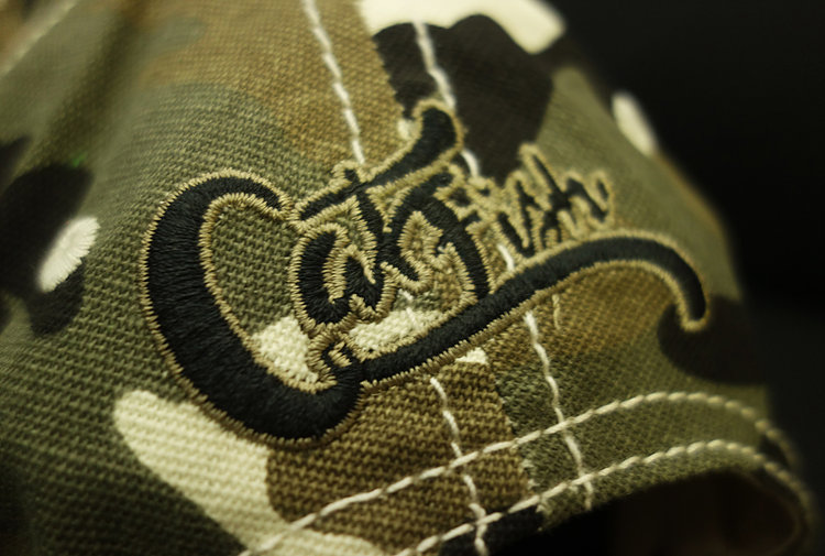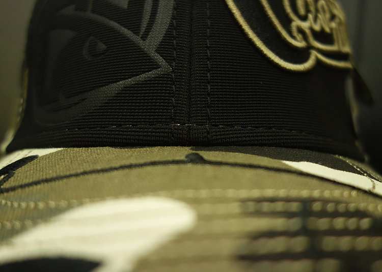 Бейсболка изготовлена с использованием двух разных тканей: лицевая панель из черного оттоманского полотна для создания элегантного контраста (оттоманский материал имеет слегка проволочный эффект) и все остальные детали из 100% хлопкового камуфляжа. Изогнутый козырек бросает удобный оттенок по лицу.